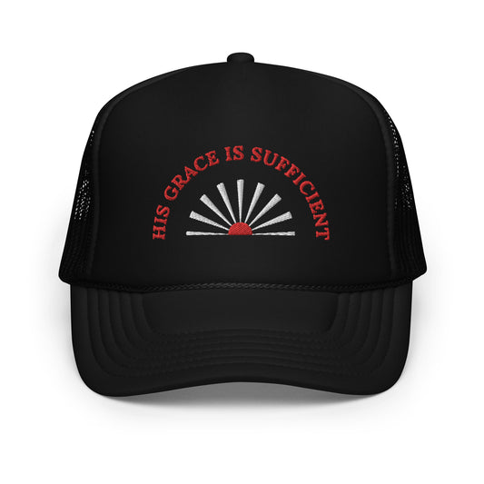 Foam Trucker Comfort Hat: "His Grace is Sufficient" in Red script