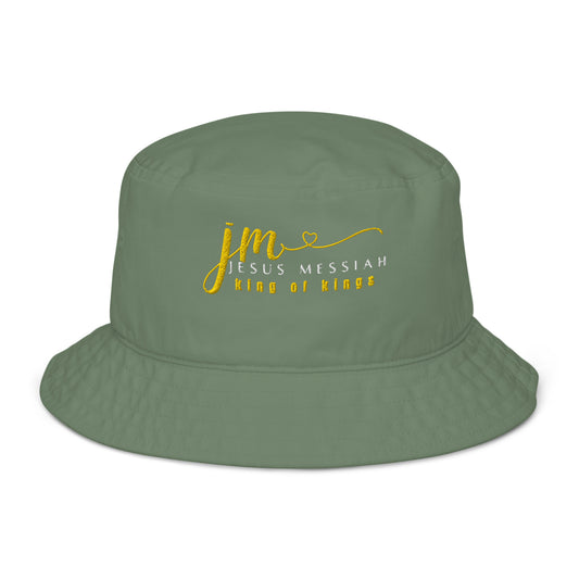 Organic Bucket Hat: "JM-Jesus Messiah" in Gold script