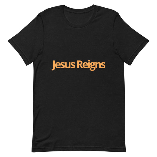 Unisex Soft and Flattering T-shirt : "Jesus Reigns" in blended Yellow and Gold print